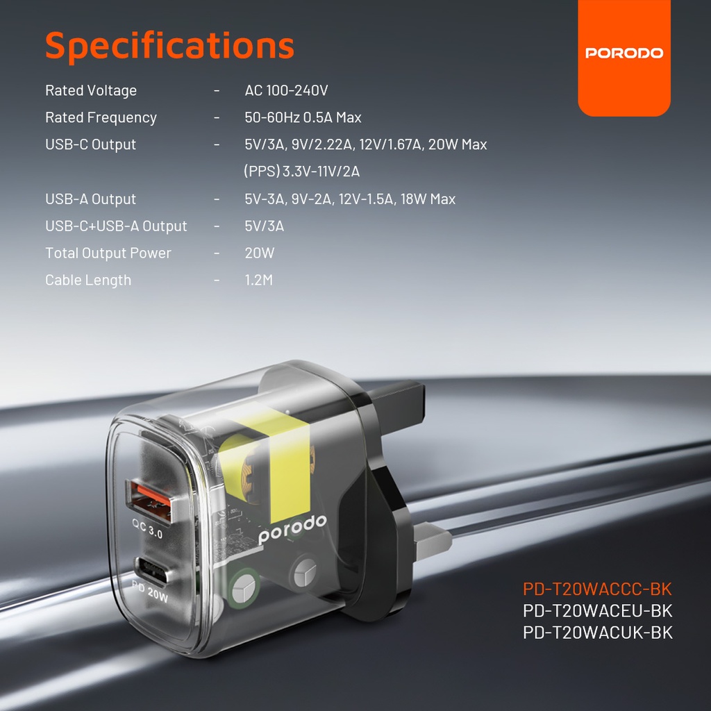 شارژر دیواری دو پورت USB-C PD و USB-A QC به همراه کابل USB-C به Lightening با بدنه شفاف پرودو T20WACCL