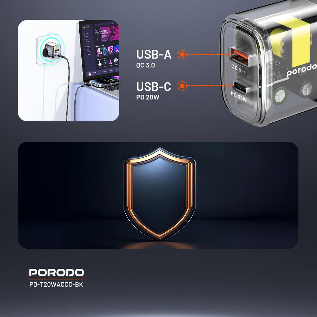 ![[PD-T20WACCC-BK] Porodo Dual Output Transparent Quick Charger USB-C PD And USB-A QC With USB-C To USB-C Cable 1.2m UK شارژر دیواری دو پورت USB-C PD و USB-A QC به همراه کابل USB-C به USB-C با بدنه شفاف پرودو T20WACCC - Image 1](https://avandigi.ir/wp-content/uploads/2025/08/PD-T20WACCC-BK-Porodo-Dual-Output-Transparent-Quick-Charger-USB-C-PD-And-USB-A-QC-With-USB-C-To-USB-C-Cable-1.2m-UK.png)